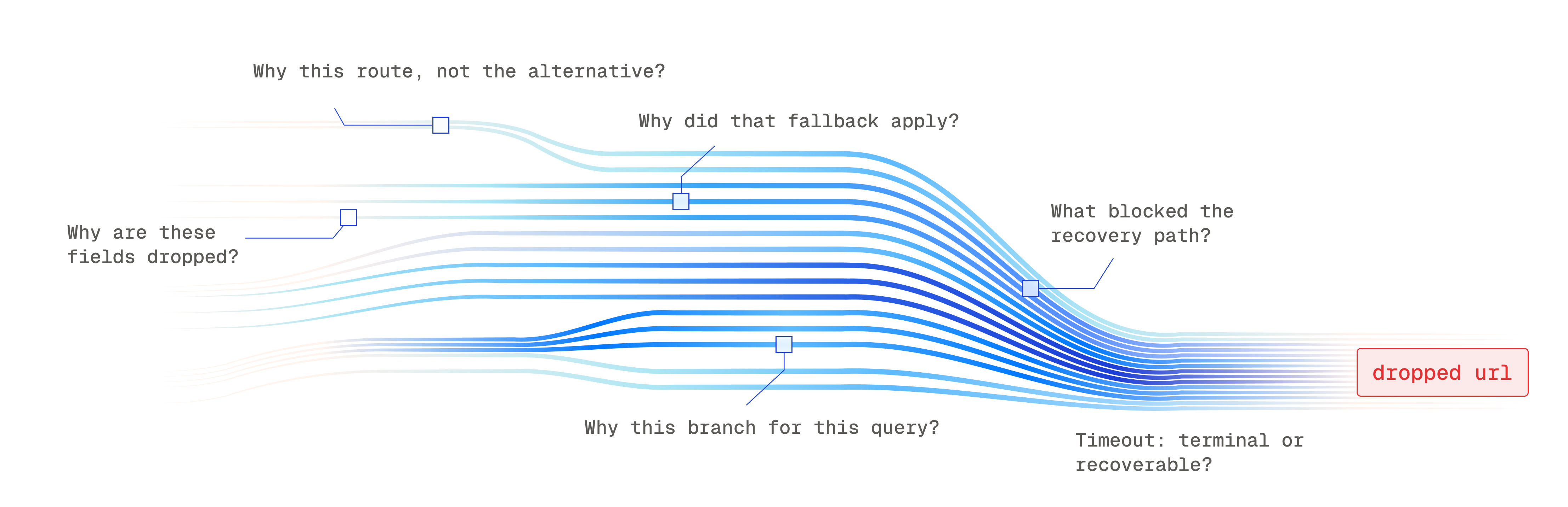 It was possible to add logs and figure out where a URL got lost in the search, but reasoning about why it got dropped was like finding a needle in a haystack, a haystack on the order of billions.
