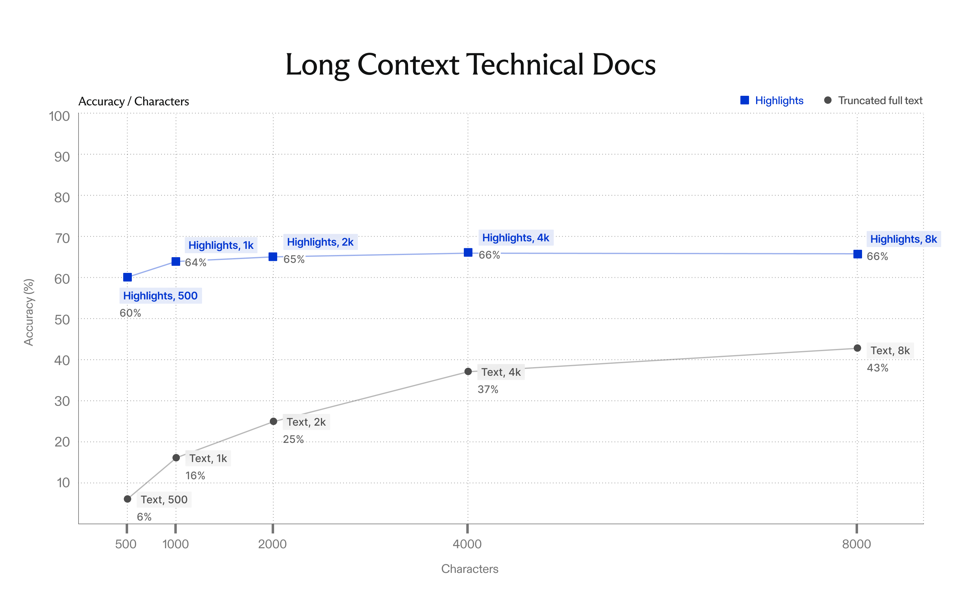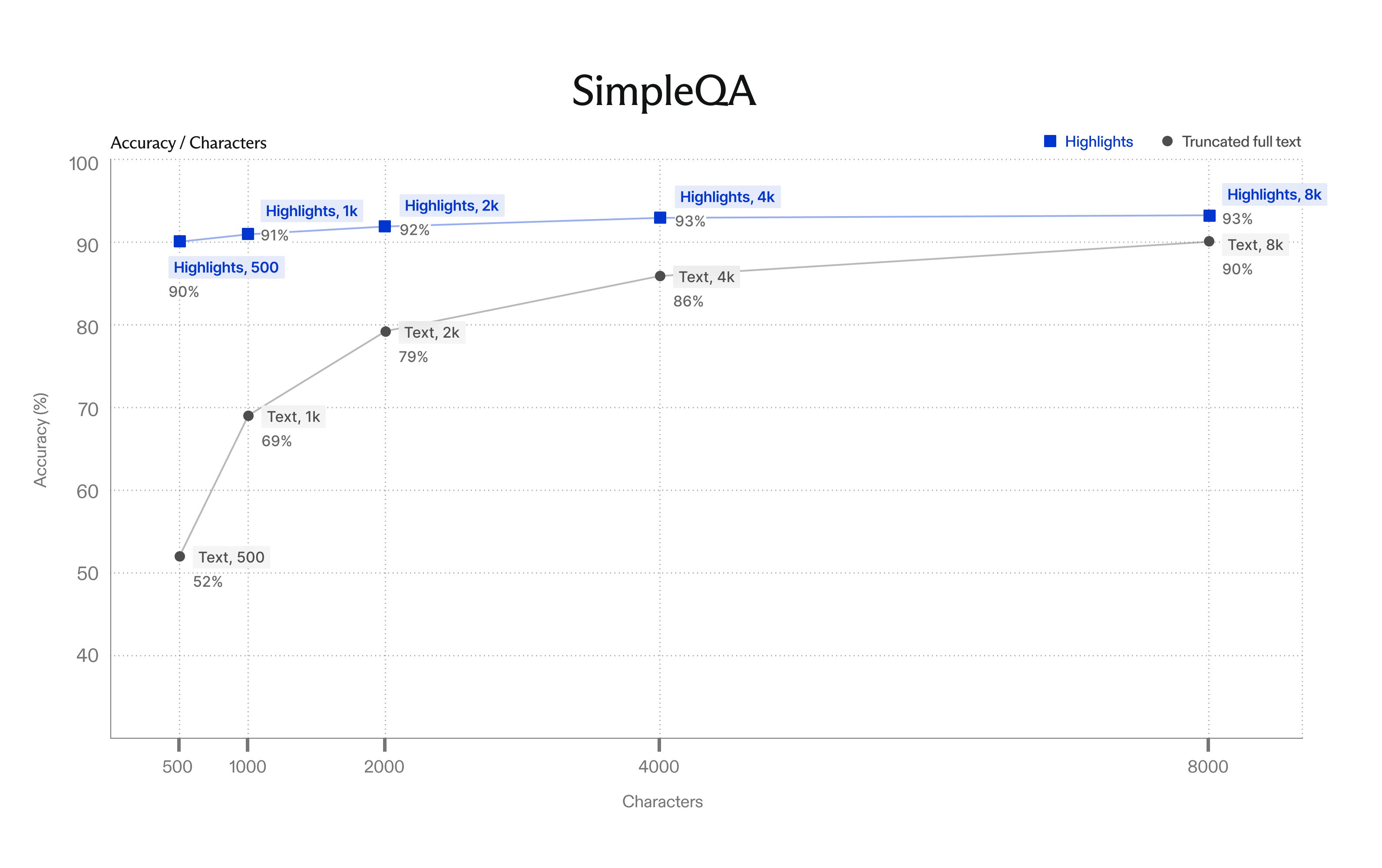 On benchmarks like SimpleQA, 500 characters of Exa's highlights match the accuracy of the first 8000 characters of the page, and use 16x fewer tokens. In addition, we found that 4k characters of highlights is better than 32k characters of full text.