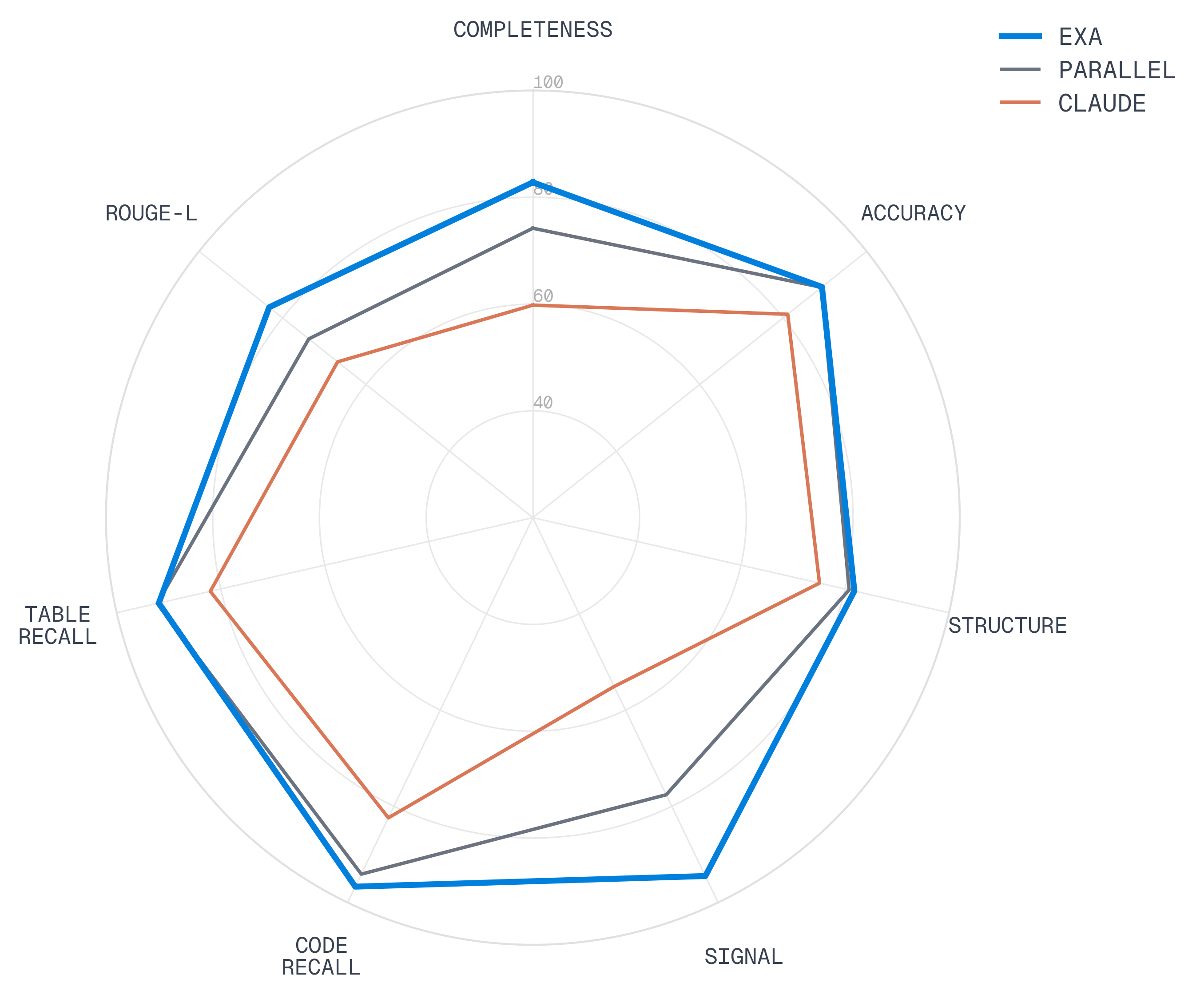 | Provider | Completeness | Signal | Structure | Accuracy | Code Recall | Table Recall | ROUGE-L |