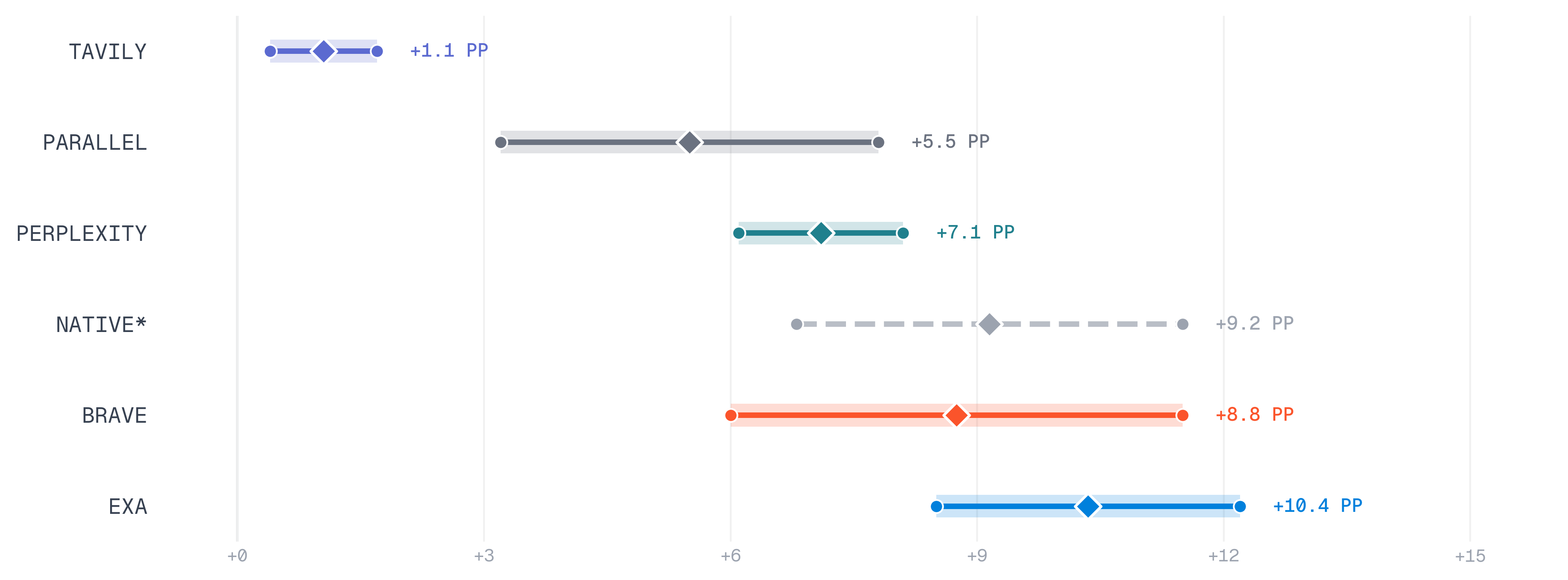 We ran multiple rollouts per provider across several frontier models. Each line shows how much that provider's pass rate improved over the no-search baseline; diamonds mark the median. Wider distributions indicate less consistent gains.