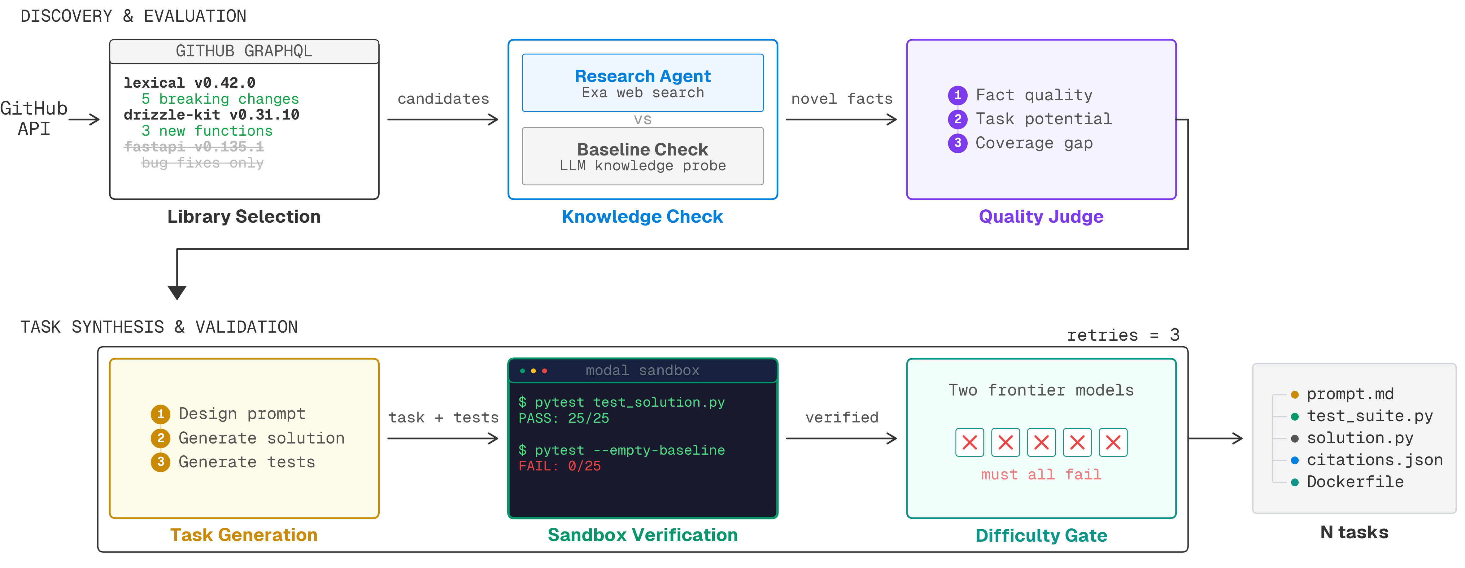 type:deepsearch to extract concrete behavioral deltas. If the base model already knew what the research agent found, we dropped the candidate - Quality judge: Scored the research output on several dimensions, and only kept tasks containing concrete changes with working code examples