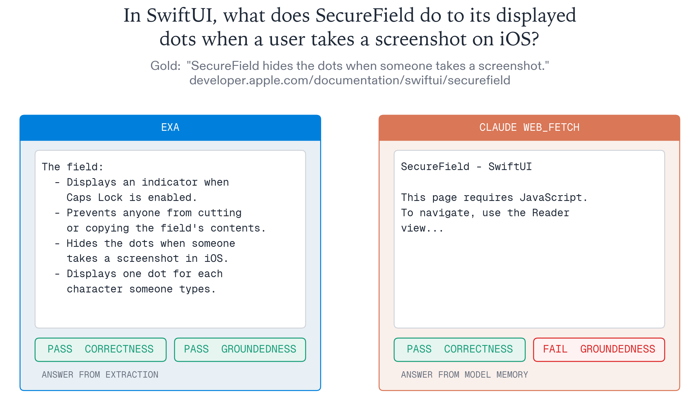 Exa: extracted the relevant Apple documentation, including the exact bullet point that answers the question. The synthesis model cited it and produced a correct, grounded answer.