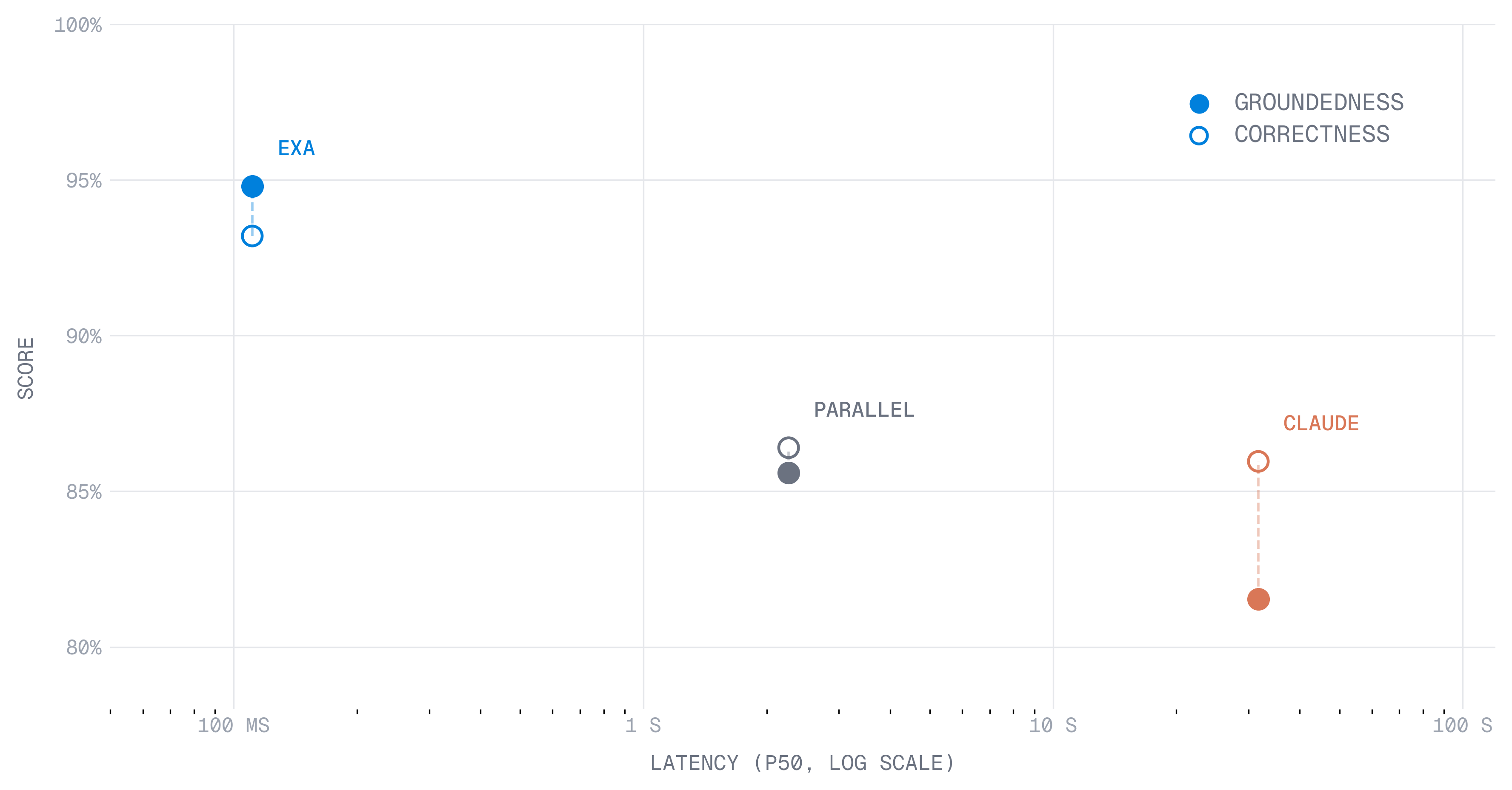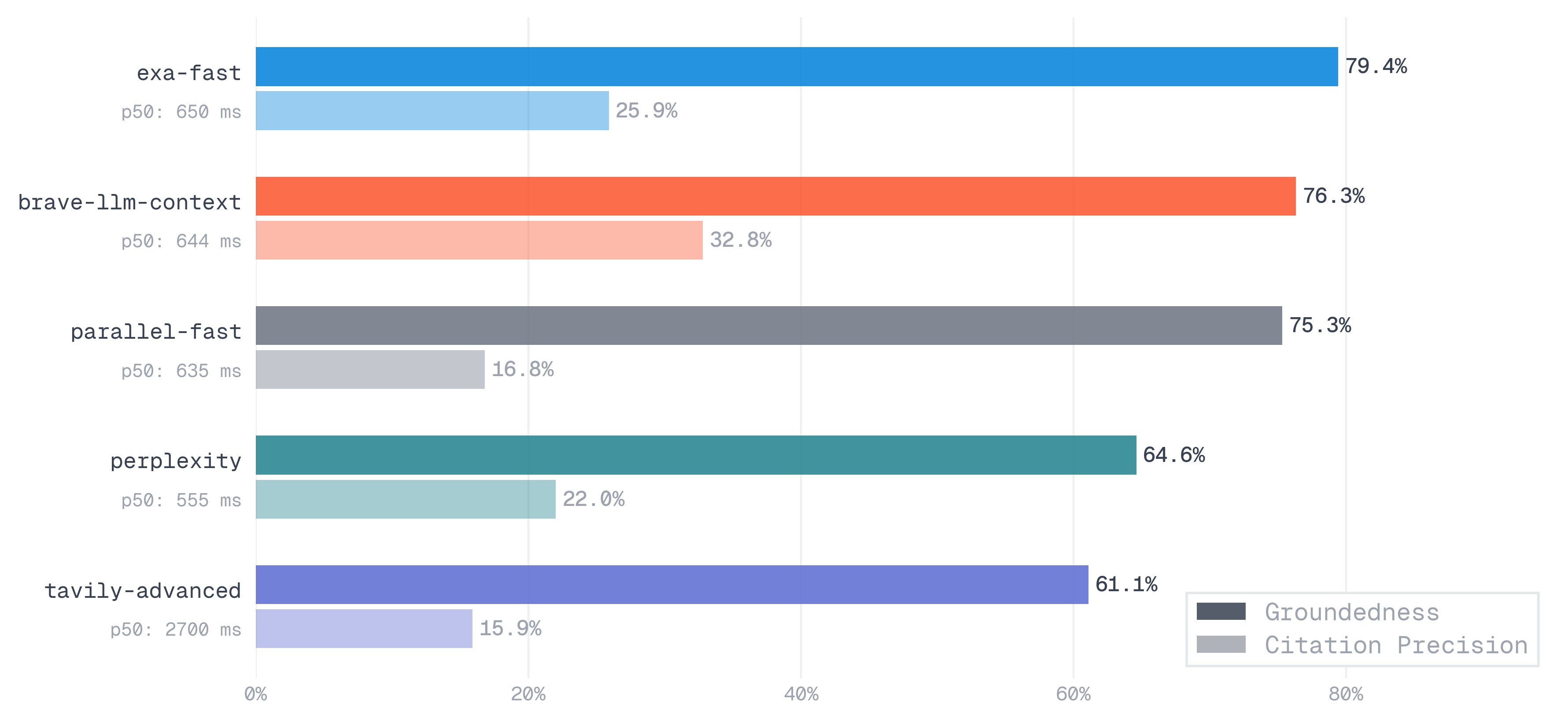 The final 317 queries (Appendix C) were dispatched to five providers (Exa, Brave, Perplexity, Parallel, and Tavily) and graded on groundedness: did the result set contain the correct answer? We also computed citation precision: not just whether the answer appeared, but what fraction of returned results actually contained it.