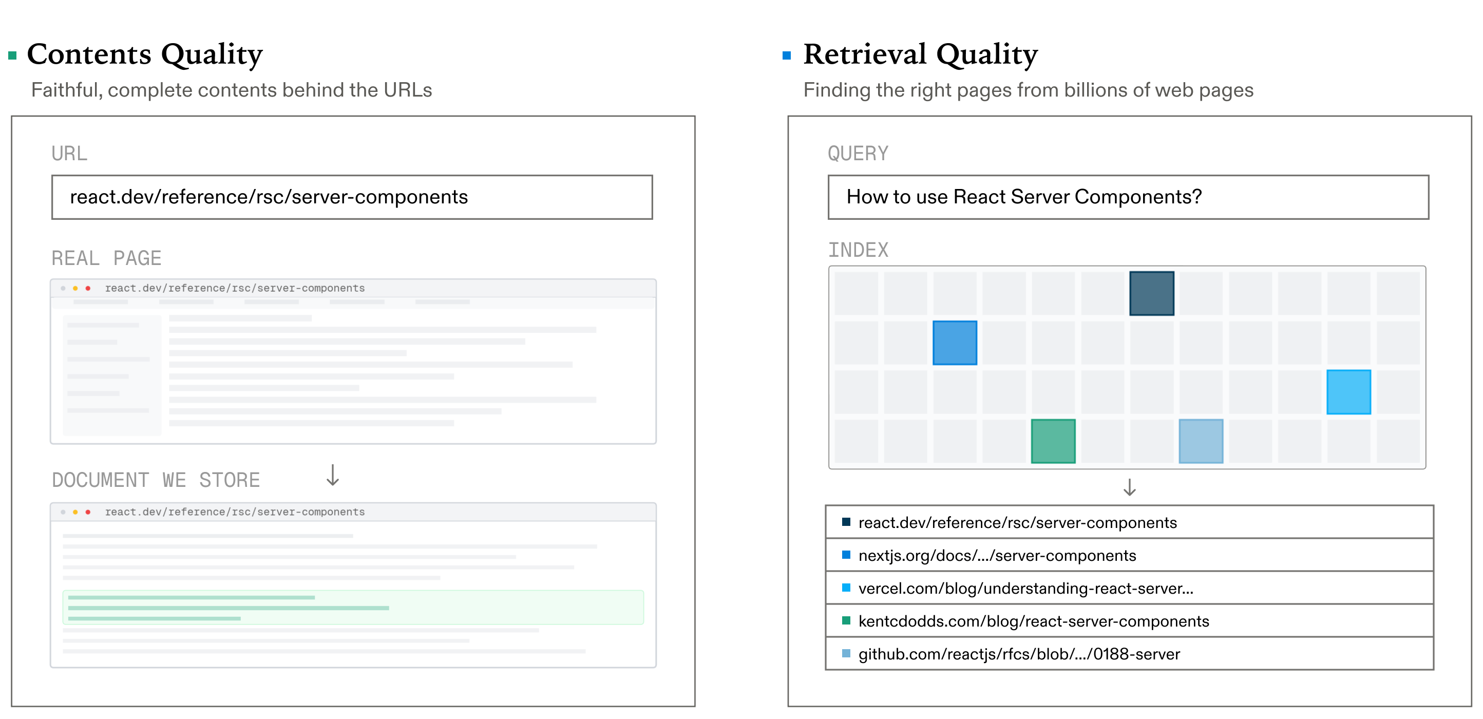 This growth pushed us to focus on code search, where precision is especially important: agents build on retrieved context across many steps, so stale or noisy search results can poison or even derail the reasoning processes of long-running agents. Documentation, changelogs, and issues update constantly, so we built a dedicated ingestion pipeline focused on fresh, clean results over full-page chrome.