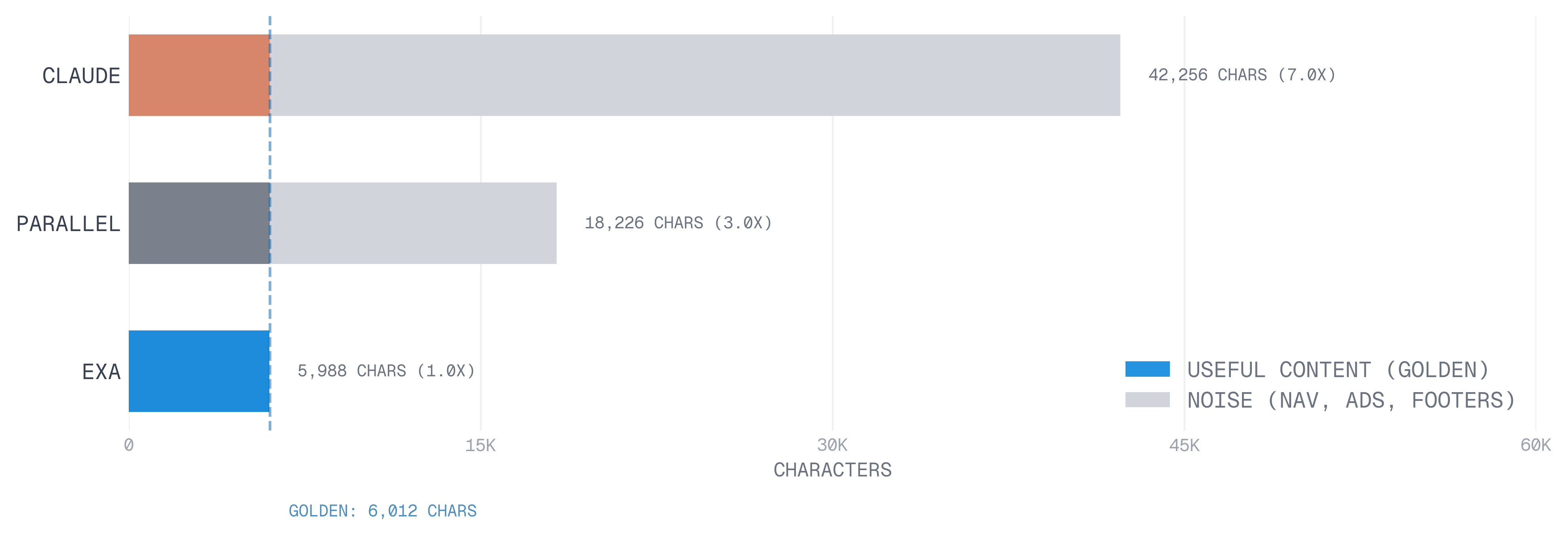 Extraction lengths vary by over an order of magnitude across providers for the same page. The 1x to 13x difference from the golden reference is driven by an excess consisting entirely of sidebars, navigation and chrome.